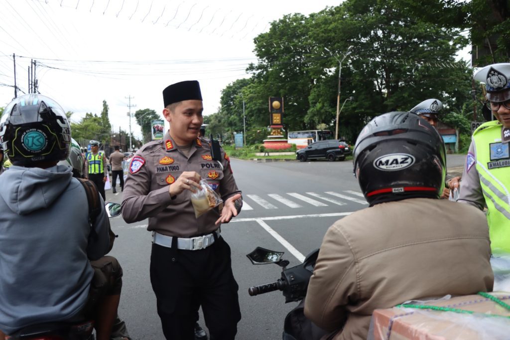 Selain membagikan takjil, personel Satlantas juga menyampaikan imbauan tertib berlalu lintas kepada para pengendara guna menjaga keselamatan selama bulan Ramadan.