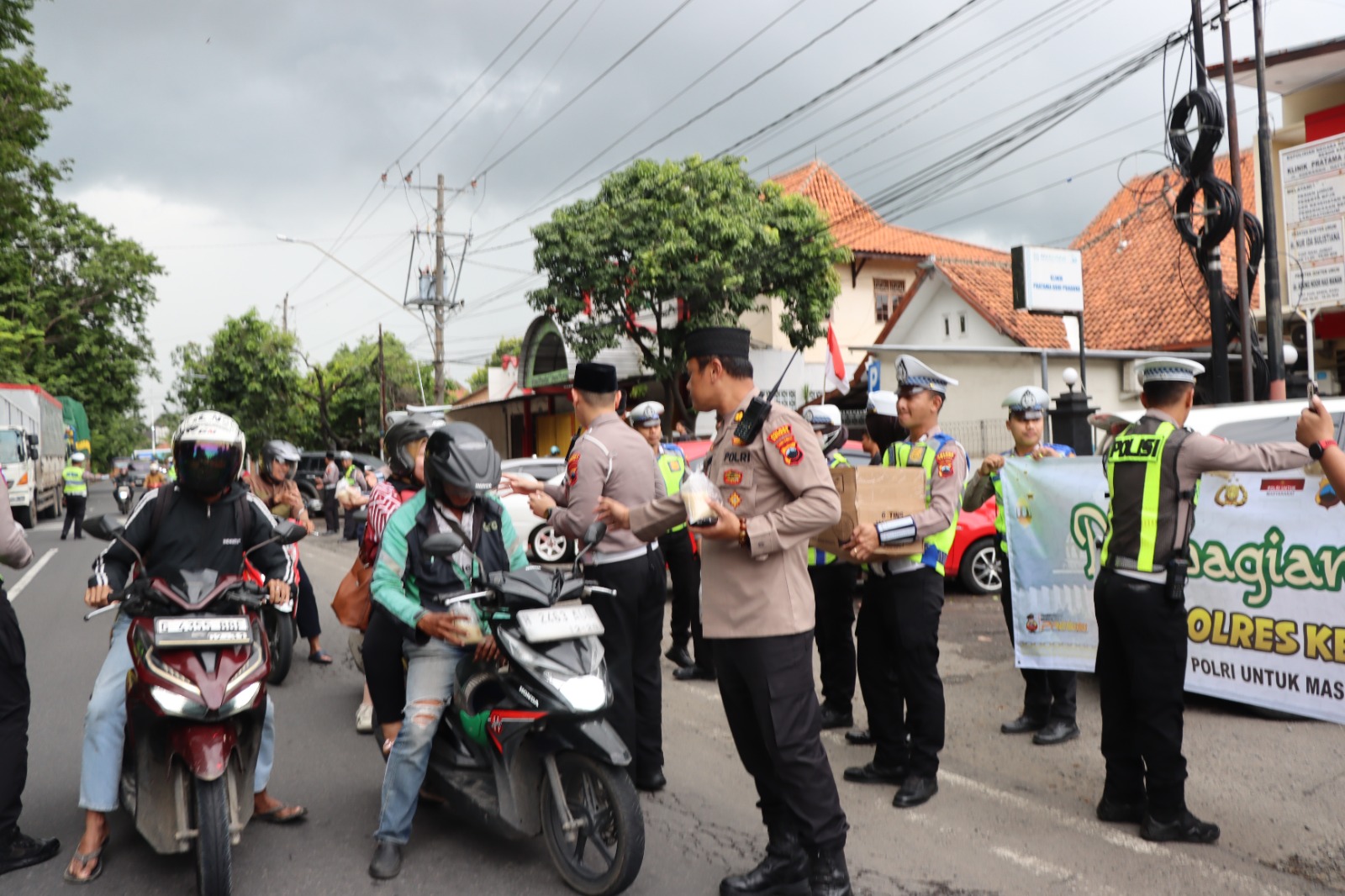 Pembagian takjil dipimpin langsung oleh Kepala Satlantas Polres Kendal, AKP Panji Yugo Putranto, bersama personel Satlantas.