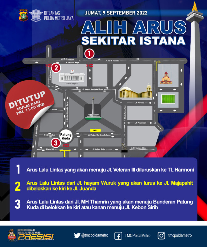 Dikutip dari akun media sosial (medsos) Instagram TMCPoldaMetro, Ditlantas Polda Metro Jaya meminta masyarakat untuk menghindari kawasan Senayan DPR-MPR, Jakarta, Jumat (9/9/2022).