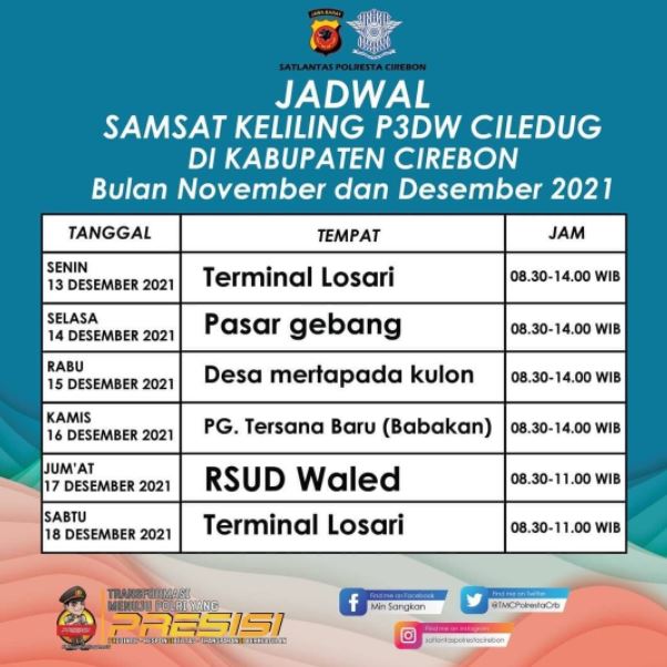Mobil Samsat Keliling Cirebon hari ini, Rabu (15/12/2021) beroperasi di desa Mertapada Kulon pukul 08.30 sampai 14.00 WIB.
