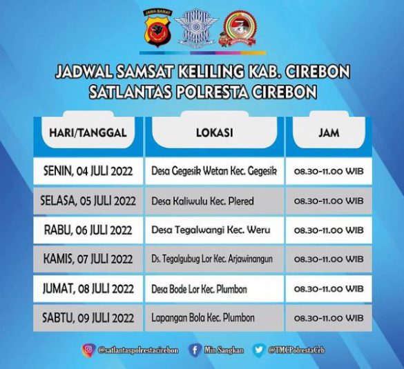 Mobil Samsat Keliling Cirebon hari ini, Selasa (5/7/2022) beroperasi di desa Kaliwulu kecamatan Plered pukul 09.00 sampai 14.00 WIB.