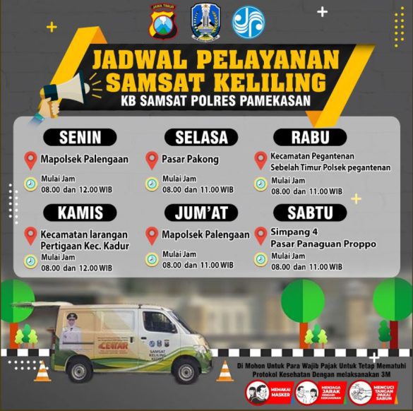 KORLANTAS POLRI – Ditengah pandemi covid-19, pelayanan Samsat Keliling Pamekasan Madura masih beroperasi. Masyarakat tetap wajib mematuhi protokol kesehatan yaitu mencuci tangan, menggunakan masker dan menjaga jarak dengan yang lainnya.