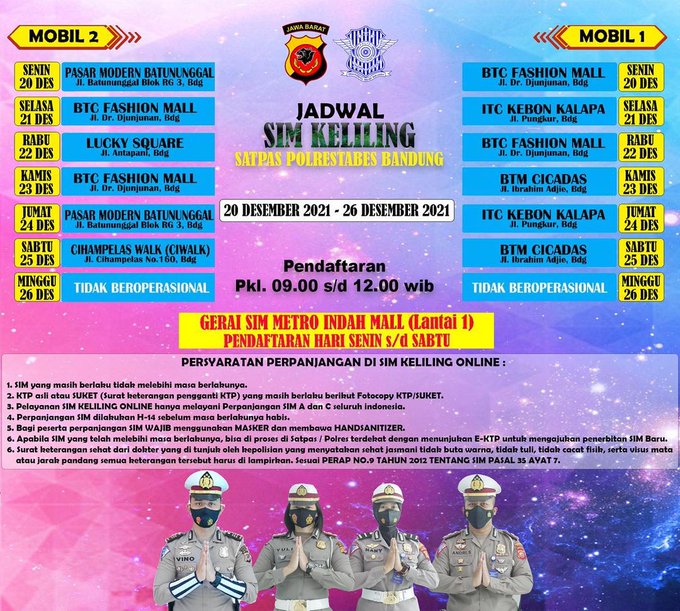 KORLANTASPOLRI – Pemerintah resmi memperpanjang kembali Pemberlakuan Pembatasan Kegiatan Masyarakat (PPKM) hingga 3 Januari 2022. Bagi anda warga kota Bandung Jawa Barat pelayanan perpanjangan Surat Ijin Mengemudi (SIM) tetap beroperasi terbatas di lokasi berikut:
