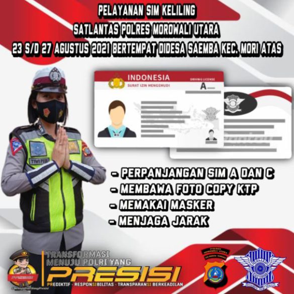 Untuk waktu layanan SIM Keliling pada hari ini Senin, 23 Agustus 2021 berlokasi di Desa Saemba Kecamatan Mori Atas mulai pukul 09.00 WITa sampai selesai.