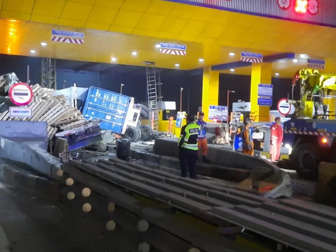 Ditgakkum Wal & PJR Jagorawi menginformasikan kejadian diawali kendaraan kecil yang sedang bertransaksi di gardu 11 ditabrak tiba-tiba truk konteiner yang diduga mengalami kendala pada fungsi rem.