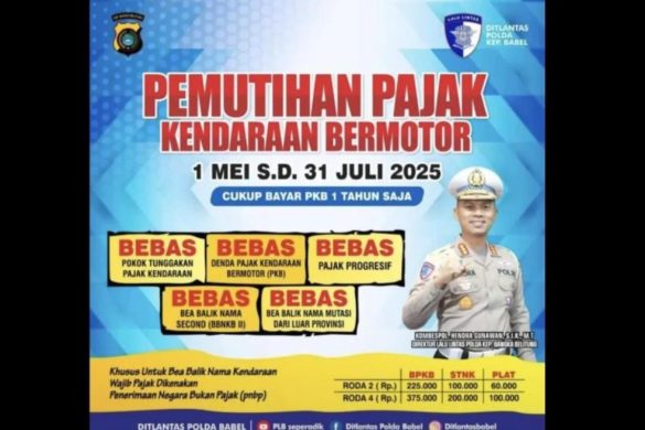 KORLANTAS POLRI, Pangkalpinang– Direktorat Lalu Lintas Polda Kepulauan Bangka Belitung mengimbau seluruh masyarakat untuk memanfaatkan program pemutihan pajak kendaraan bermotor (PKB) yang digelar oleh pemerintah daerah mulai 1 Mei hingga 31 Juli 2025.