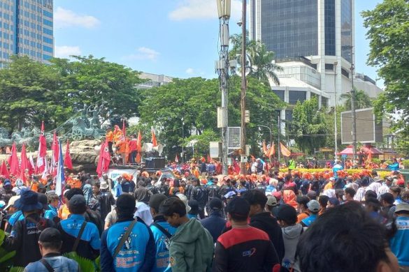 KORLANTAS POLRI – Massa buruh yang tergabung dari berbagai elemen berkumpul di kawasan Patung Arjuna Wijaya atau Patung Kuda, Jakarta Pusat, pada Sabtu (14/1/2023). Guna mengantisipasi kepadatan arus lalu lintas, kepolisian memberlakukan rekayasa lalu lintas.