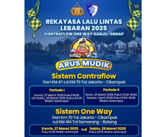 Rekayasa lalu lintas one way dan contraflow bersifat situasional sesuai dengan diskresi kepolisian. Bagi para pemudik diimbau untuk tetap berhati-hati, mengikuti arahan petugas di lapangan dan memperhatikan jadwal, rute rekayasa lalu lintas agar perjalanan lebih lancar dan nyaman.