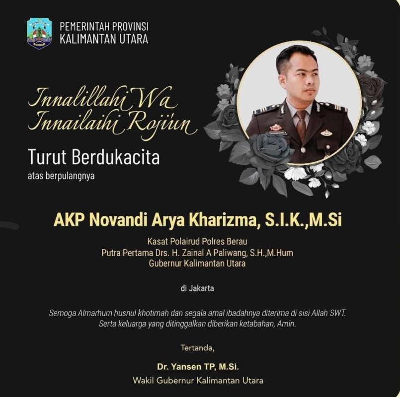 “Innalillahi Wa Innailaihi Rojiun. Jajaran Pemprov Kalimantan Utara mengucapkan duka cita atas berpulangnya AKP Novandi Arya Kharizma, S.I.K., M.Si, Putra Gubernur Kalimantan Utara Drs. H. Zainal A Paliwang, S.H.,M.Hum di Jakarta,” tulis Instagram tersebut.