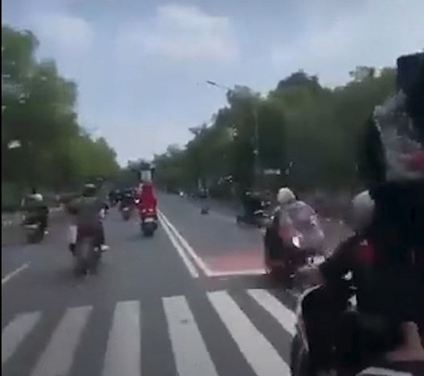 Dalam video yang diunggah oleh akun X @Heraloebss berdurasi 17 detik, memperlihatkan beberapa pria mengenakan sabuk kain hijau diikat di pinggang, dan berdiri di bagian jok belakang motor yang mereka tumpangi dengan menggunakan plat motor H .