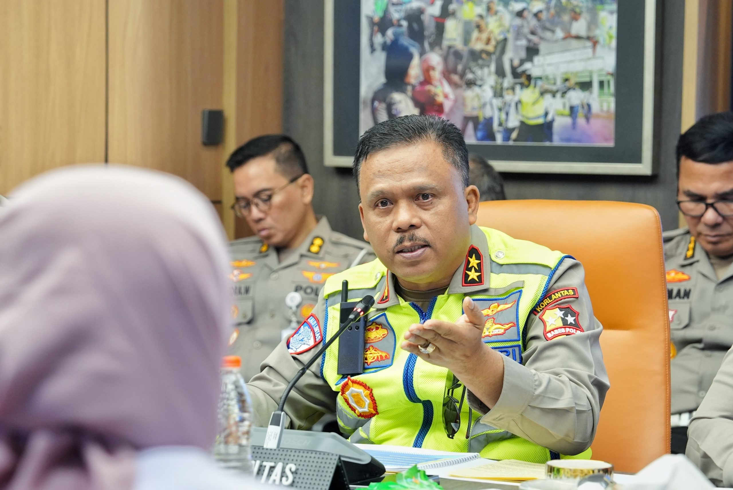 “Dasar kami untuk menjabarkan program-program di Korlantas adalah di samping undang-undang LLAJ (Lalu Lintas dan Angkutan Jalan), Undang-Undang Nomor 22 Tahun 2009 tentang LLAJ, juga program kebijakan Bapak Kapolri tentang Beyond Trust Presisi,” tambahnya.
