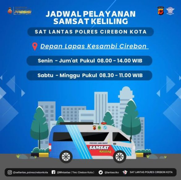 Mobil Samsat Keliling Kota Cirebon hari ini, Selasa (21/2/2023) beroperasi di depan lapas Kesambi Cirebon pukul 08.00 sampai 14.00 WIB.