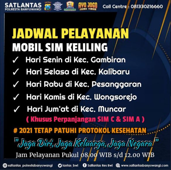 Untuk waktu layanan SIM Keliling pada hari ini Kamis, 28 Januari 2021 berlokasi di Kecamatan Wongsorejo mulai pukul 08.00 s / d 12.00 WIB.