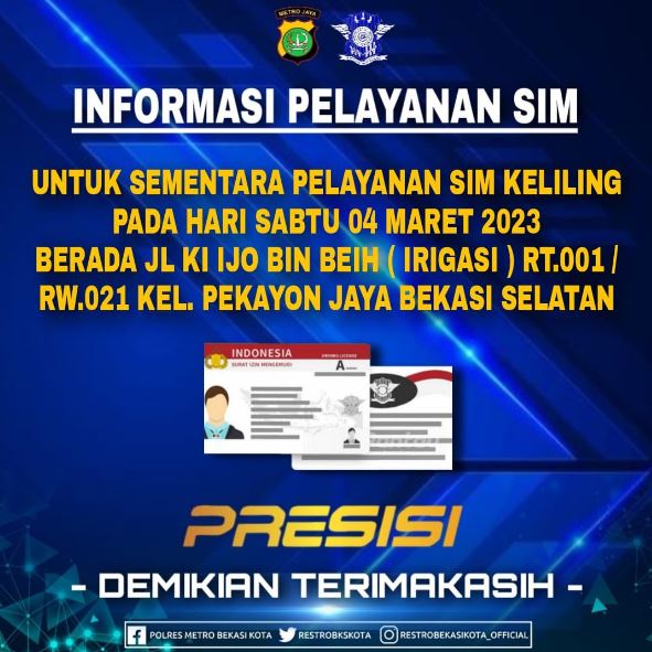 Demikian informasi pelayanan SIM Keliling Polrestro Bekasi Kota semoga bermanfaat.