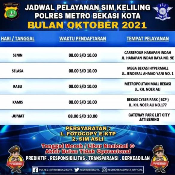 Demikian informasi pelayanan SIM Keliling Polrestro Bekasi Kota semoga bermanfaat.