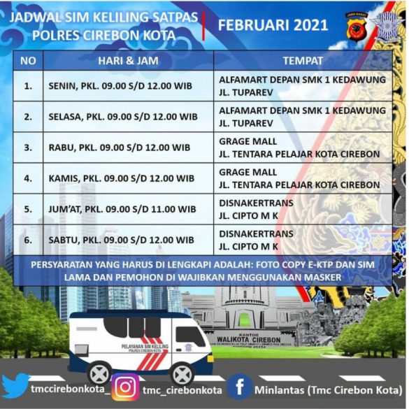 KORLANTAS POLRI – Ditengah mewabahnya Covid-19, bagi anda warga Cirebon yang ingin melakukan perpanjangan SIM anda dapat melakukan perpanjangan di SIM Keliling Polres Cirebon Kota.