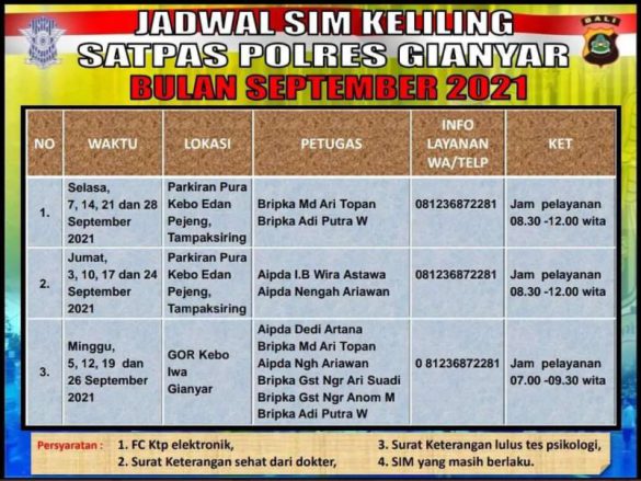 Untuk waktu layanan SIM Keliling pada hari ini Jumat, 17 September 2021 berlokasi di GOR Kebo Iwa Gianyar, Tampaksiring mulai pukul 08.30 s/d 12.00 WITa.
