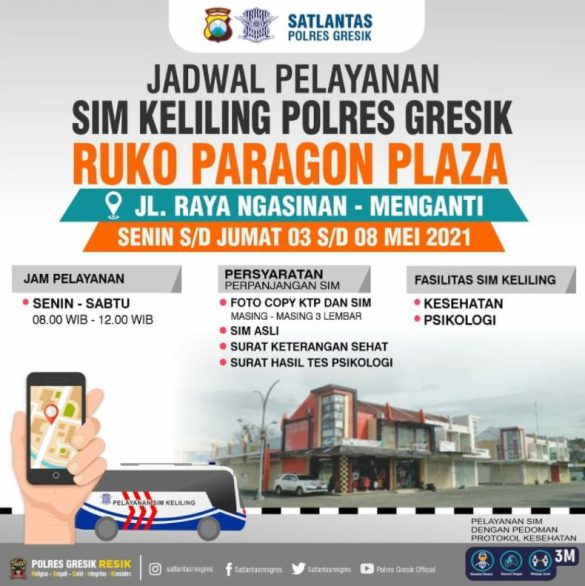 KORLANTAS POLRI – Dalam kondisi masih mewabahnya Covid-19, bagi anda warga Gresik Jawa Timur yang ingin melakukan perpanjangan SIM anda dapat melakukan perpanjangan di SIM Keliling Polres Gresik.