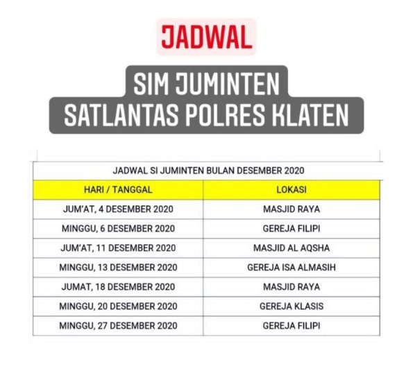 Untuk waktu layanan SIM Keliling pada hari ini Minggu, 20 Desember 2020, Polres Klaten memiliki program SIJUMINTEN yaitu SIM Jumat Minggu Enten, berlokasi di Gereja Klasis mulai pukul 07.00 WIB s/d selesai.