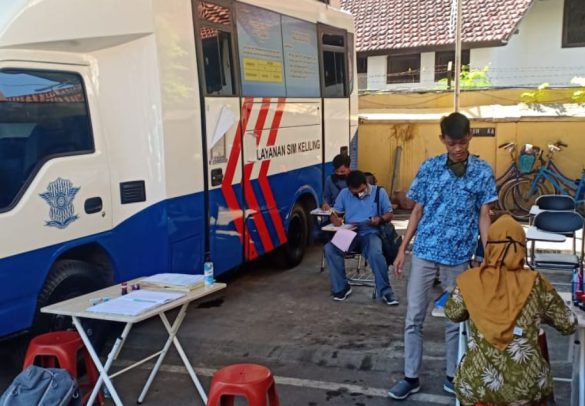 Pelayanan SIM Keliling menggunakan SOP Kesehatan yaitu pemohon wajib menggunakan masker serta menerapkan physical distancing.