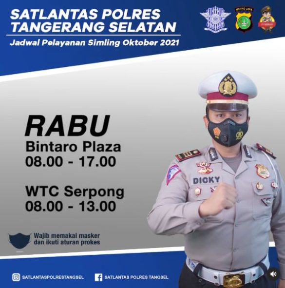 KORLANTASPOLRI – Pemerintah kembali memperpanjang Pemberlakuan Pembatasan Kegiatan Masyarakat (PPKM) level 2-4 hingga 18 Oktober 2021. Bagi anda warga Tangerang Selatan yang ingin melakukan perpanjangan Surat Ijin Mengemudi (SIM), pelayanan SIM Keliling Polres Tangsel tetap beroperasi terbatas.