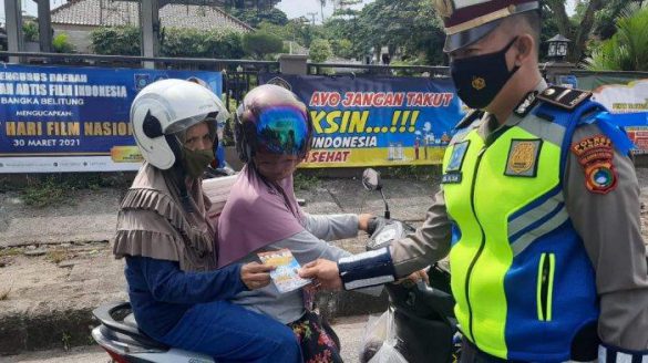 KORLANTAS POLRI – Satlantas Polres Bangka melaksanakan pembagian masker gratis kepada pengendara serta menempelkan stiker Rabu (14/4/2021) dalam rangka Operasi Keselamatan 2021.