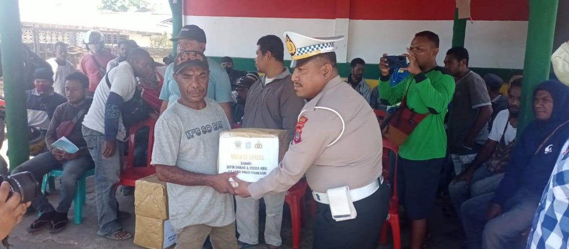KORLANTASPOLRI – Memperingati Hari Lalu Lintas Bhayangkara ke-67, Satlantas Polres Manokwari menyalurkan 100 paket sembako kepada pengojek yang terdampak langsung kenaikan harga BBM.