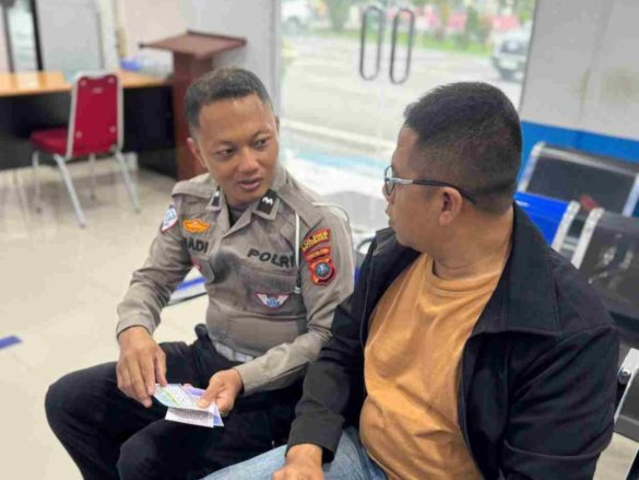 Petugas juga membagikan brosur berisi informasi mekanisme pengurusan SIM. Brosur ini diberikan agar masyarakat memahami proses pengurusan SIM secara resmi dan terhindar dari praktik percaloan.