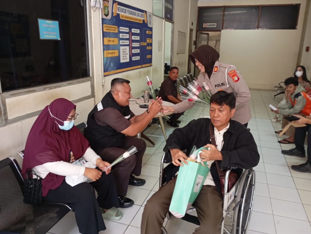 KORLANTAS POLRI, Jakarta – Suasana berbeda terlihat di ruang pelayanan publik Satlantas Polres Metro Jakarta Barat pada Senin (1/9). Dalam rangka memperingati Hari Ulang Tahun (HUT) ke-77 Polisi Wanita (Polwan), anggota Polwan Satlantas menggelar aksi simpatik dengan membagikan bunga kepada masyarakat yang tengah mengurus administrasi lalu lintas.