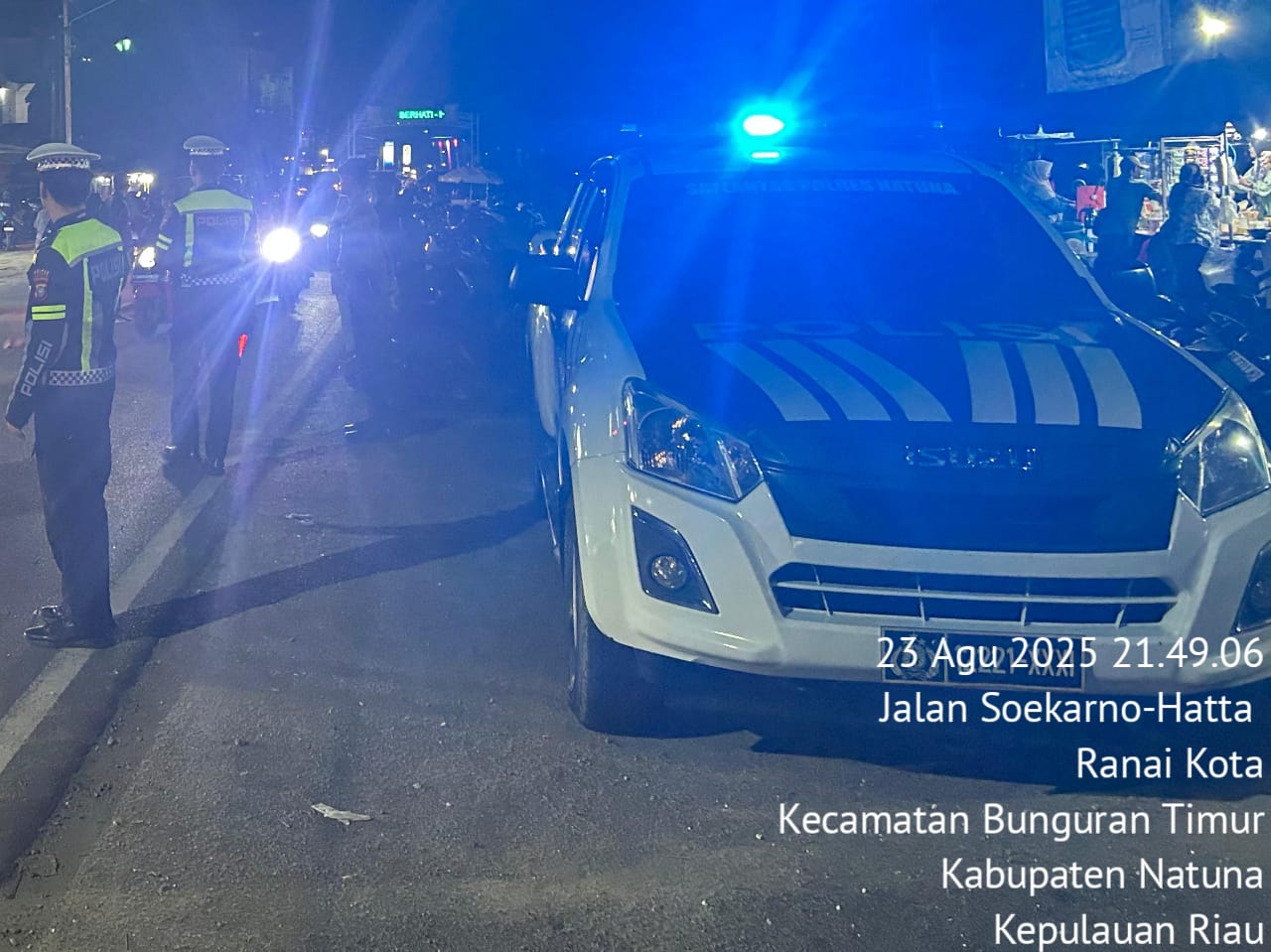 Kegiatan dipimpin langsung oleh Kasat Lantas Polres Natuna, IPTU Erwan Toni, dengan dukungan satu unit mobil patroli, tongkat, serta handlamp. Rute patroli meliputi Simpang Pos Lantas, Masjid Agung, Simpang Globe, Pantai Piwang (lokasi turnamen voli HUT RI ke-80), hingga Malam Puncak Acara “Indonesia Is Me.”