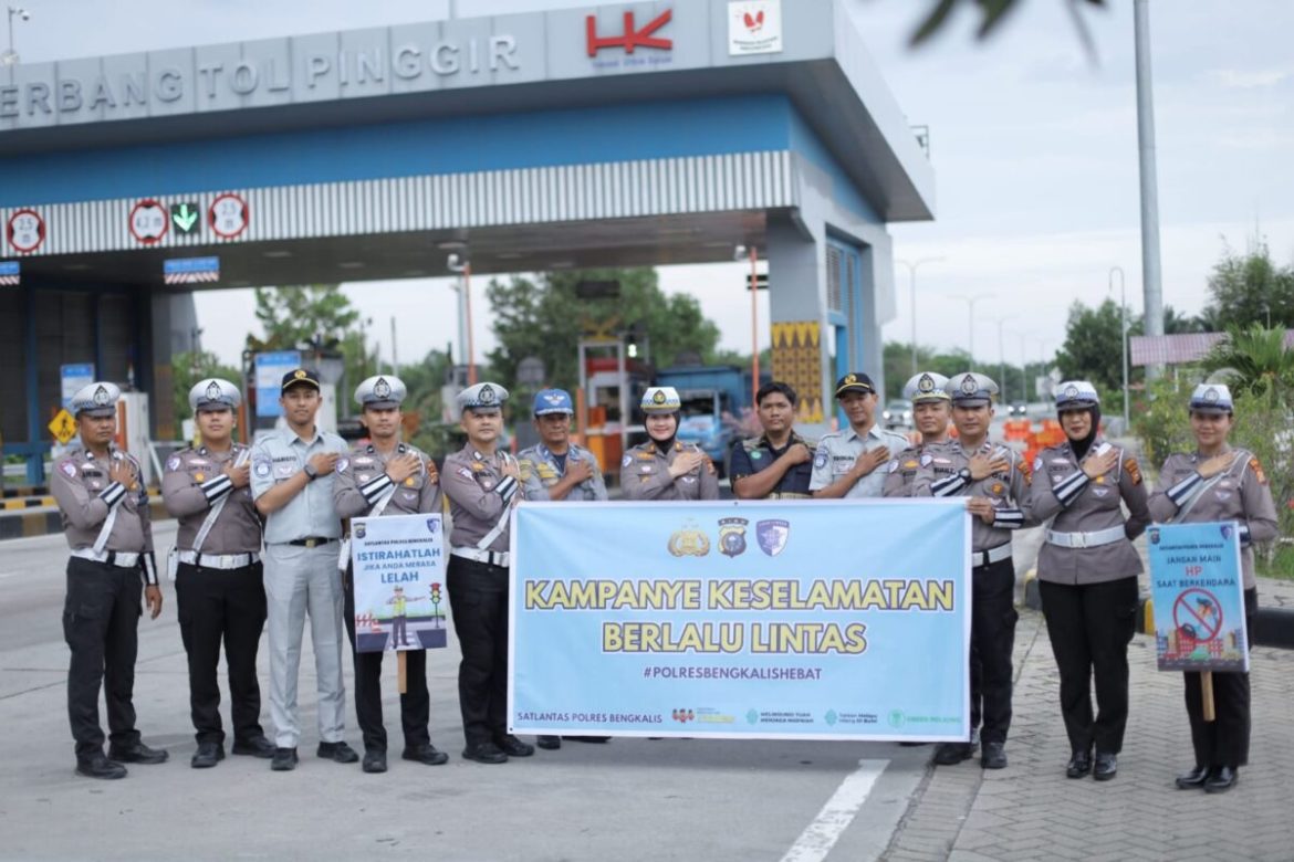 KORLANTAS POLRI, Bengkalis – Satuan Lalu Lintas (Satlantas) Polres Bengkalis menggelar kampanye keselamatan berlalu lintas sekaligus sosialisasi Operasi Keselamatan Lancang Kuning 2026 di depan Exit Tol Pinggir, Kelurahan Balai Raja, Kecamatan Pinggir, Kabupaten Bengkalis, Kamis (29/1/2026) sore.