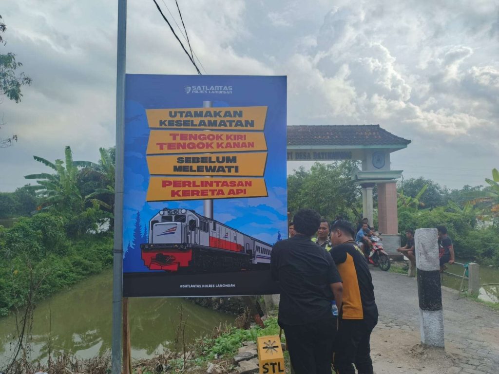 Satlantas Polres Lamongan Pasang Banner Imbauan Keselamatan di Perlintasan KA