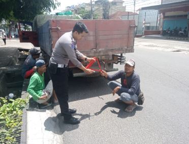 KORLANTAS POLRI, Jambi – Menjelang Hari Ulang Tahun Lalu Lintas Bhayangkara ke-70, Satlantas Polresta Jambi memberikan segitiga pengamanan kepada para pengemudi truk yang melintas di seputaran jalan lingkar kota Jambi.