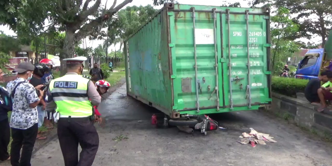 Namun pada saat menyalip, kontainer yang diangkutnya menyangkut di pohon. Sehingga langsung terjatuh dan menimpa pengendara motor yang ada di belakangnya.