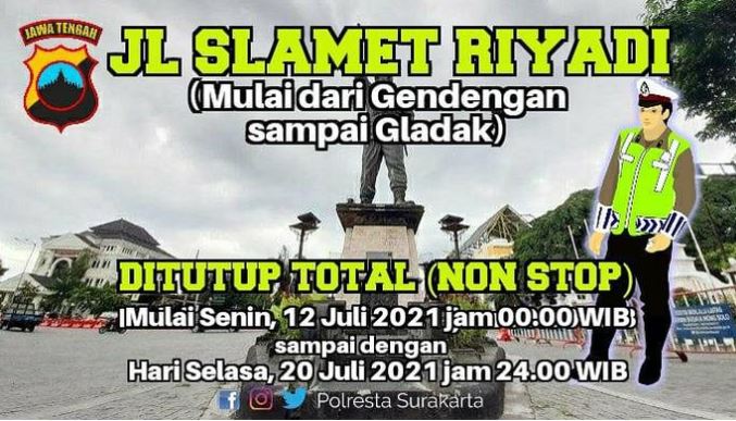 KORLANTAS POLRI – Jalan Slamet Riyadi, Kota Solo, Jawa Tengah mulai dari simpang empat Gendengan sampai Gladak akan ditutup setiap hari mulai besok selama PPKM Darurat. Sebelumnya ruas jalan ini …